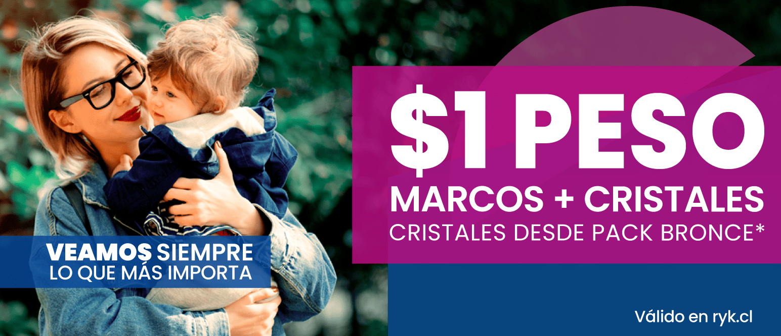 Promoción válida desde el 1 al 30 de septiembre de 2025. Por la compra de marcos ópticos seleccionados + cristales monofocales desde pack bronce en adelante, solo el marco óptico queda a $1. Promoción exclusiva en www.ryk.cl. No acumulable con otras promociones, descuentos y/o convenios. Promoción válida hasta agotar stock de productos en promoción (300 unidades).
