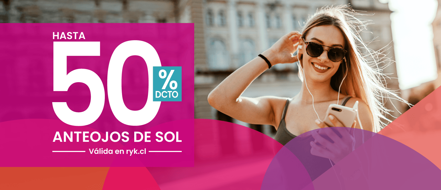 Hasta 50% de descuento en anteojos de sol seleccionados. Descuento válido del 1 al 30 de septiembre del 2025 o hasta agotar stock de 2.000 unidades. Promoción válida en ryk.cl. No acumulable con otras promociones, descuentos y/o convenios. Anteojos utilizados en la imagen son referenciales.