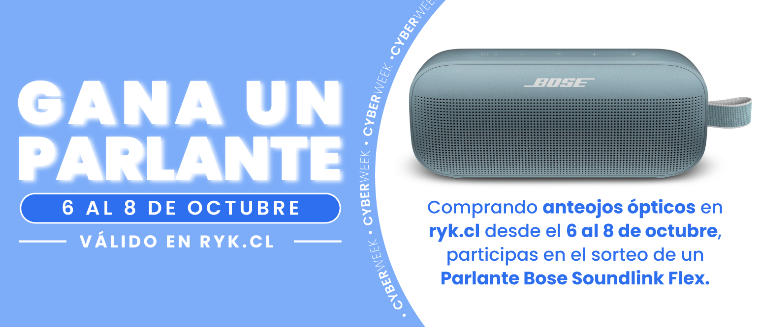 Promoción válida desde el 6 al 8 de octubre 2025. Todas las compras de anteojos ópticos en ryk.cl participan en el sorteo de uno de los 2 Parlantes Bosé. No acumulable con otras promociónes, descuentos y/o convenios.