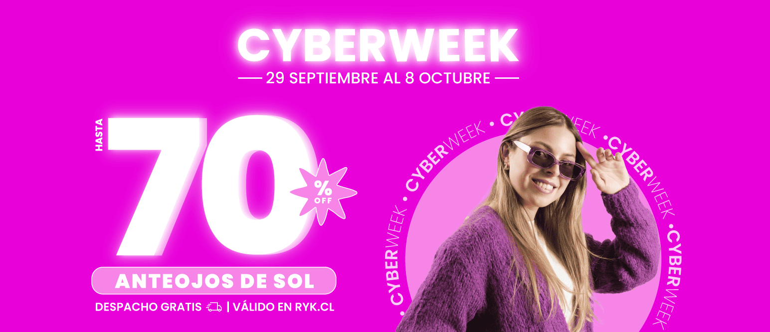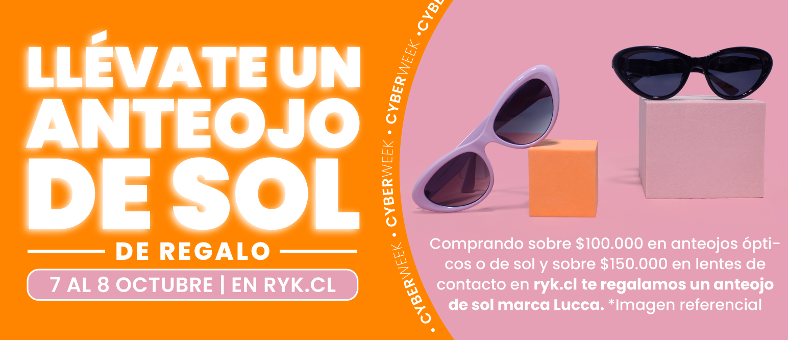Hasta 70% de descuento en anteojos de sol seleccionados. Descuento válido desde el 29 de septiembre al 8 de octubre de 2025 o hasta agotar stock de 1.000 unidades. No acumulable con otras promociones, descuentos y/o convenios. Promoción válida en www.ryk.cl. Anteojos utilizados en la imagen son referenciales.