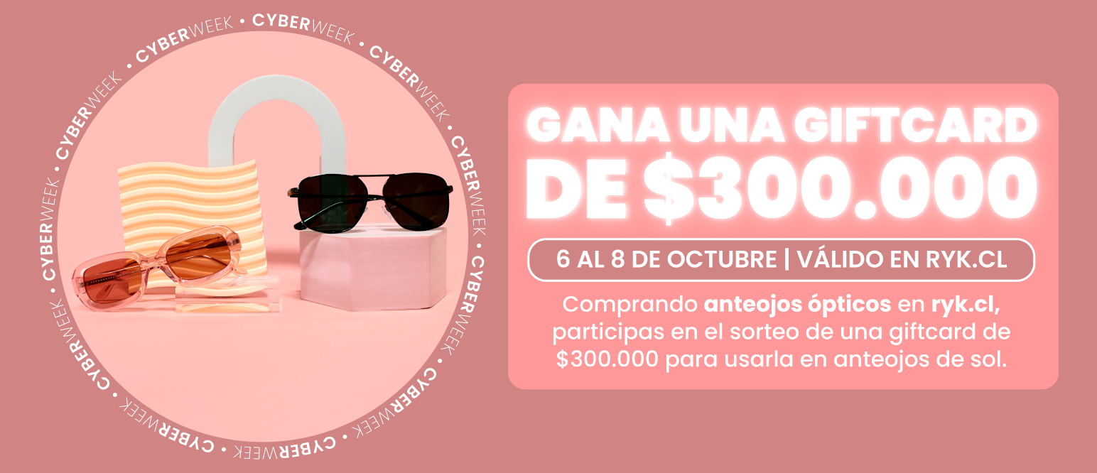Participa en el sorteo de 1 Gift Card de $300.000 cada una para comprar anteojos de Sol en Rotter y Krauss. Todas las compras de anteojos ópticos entre el 6 y 8 de octubre 2025 acumula una oportunidad de participar, cantidad máxima de concursantes 20.000. El sorteo es válido únicamente para la categoría mencionada y no es acumulable con otras promociones. Válido solo en www.ryk.cl