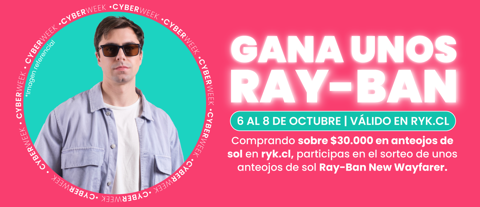 Participa en el sorteo del anteojo de sol Ray Ban SKU: F3410651 (no a libre elección). Todas las compras sobre $30.000 en anteojos de sol entre el 6 y 8 de octubre 2025 acumula una oportunidad de participar, cantidad máxima de concursantes 20.000. El sorteo es válido únicamente para la categoría mencionada y no es acumulable con otras promociones. Válido solo en ryk.cl
