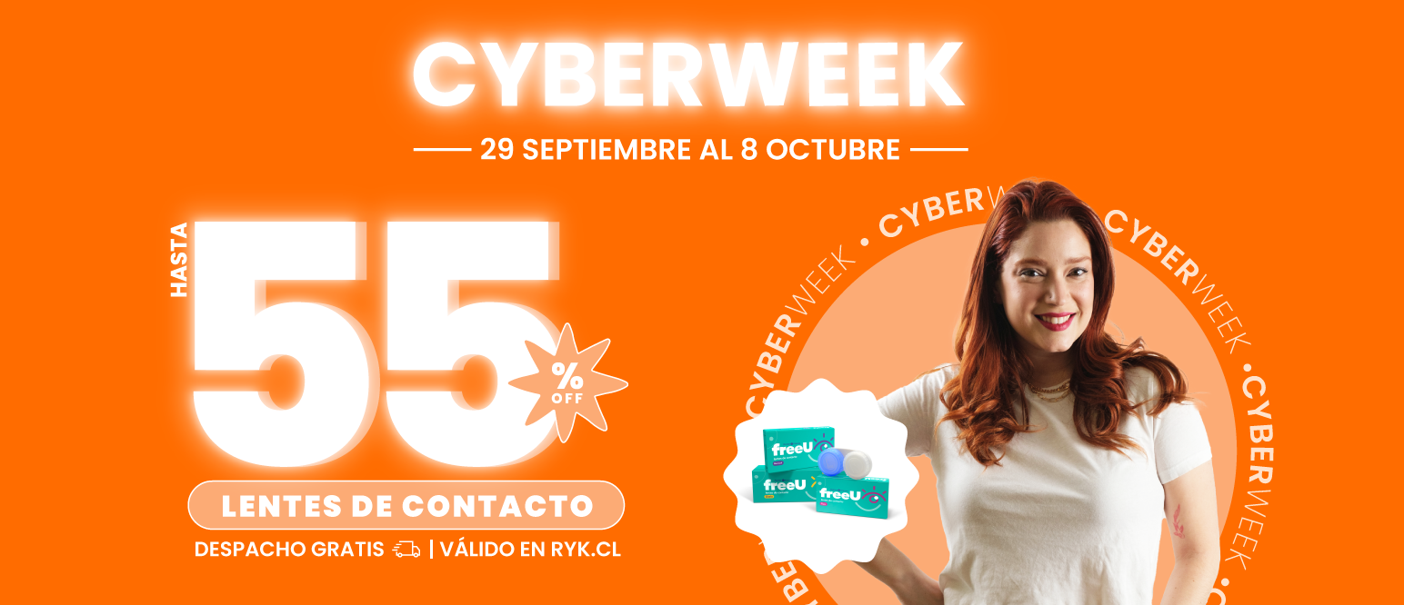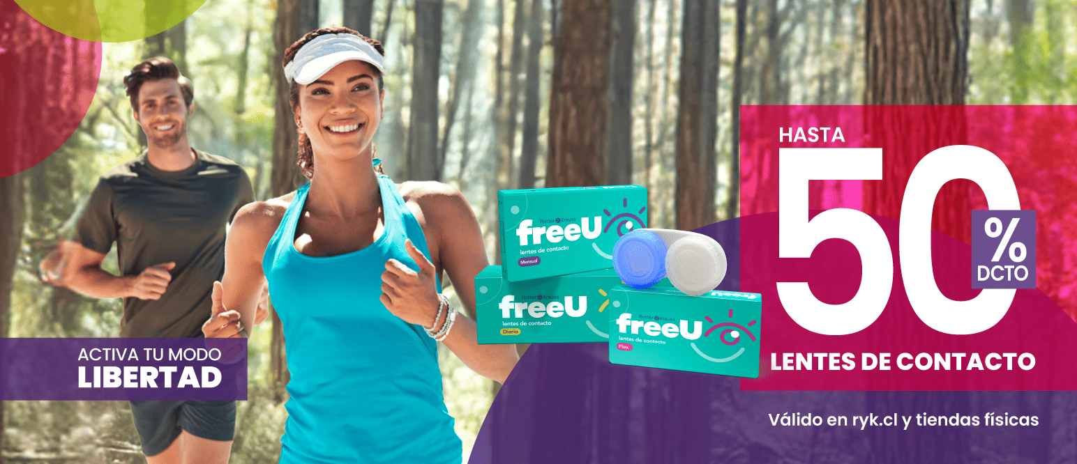 Hasta 50% de descuento en lentes de contacto FreeU Diario desde 4 cajas, 35% en FreeU Flex desde 4 cajas y 25% en FreeU Mensual desde 4 cajas. Descuentos no acumulables con otras promociones, descuentos y/o convenios. Sujeto a disponibilidad de stock. Descuento válido desde el 1 al 30 de septiembre de 2025. Promoción válida en tienda online ryk.cl