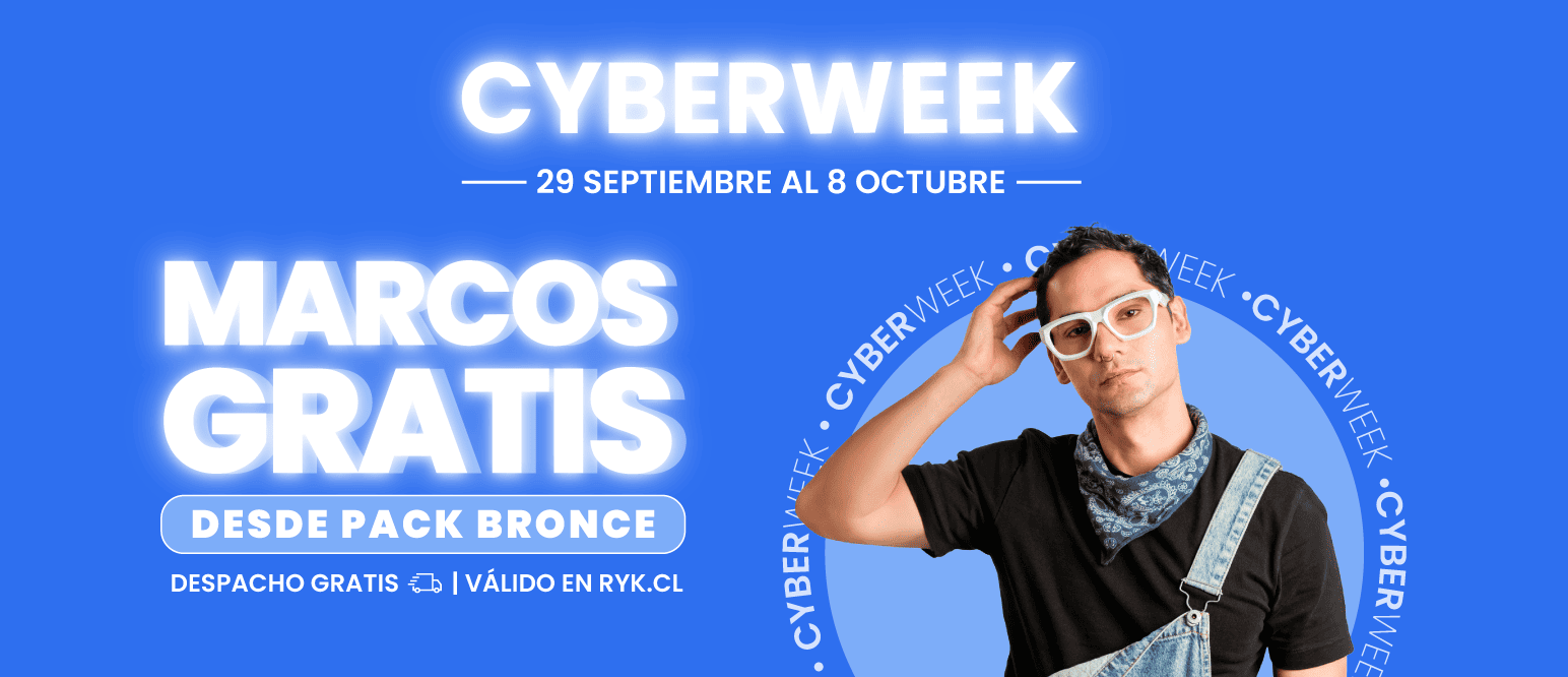 Promoción válida desde el 29 de septiembre al 8 de octubre de 2025. Por la compra de marcos ópticos seleccionados + cristales monofocales desde pack bronce en adelante, el marco queda a $0. Promoción exclusiva en www.ryk.cl. No acumulable con otras promociones, descuentos y/o convenios. Promoción válida hasta agotar stock de productos en promoción (500 unidades).